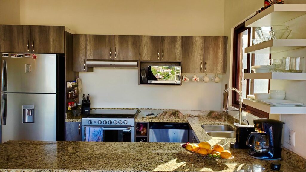 The kitchen is fully equipped if you desire to cook or not and what I loved most was the open floor plan. I cook often and go to the farmers market so a full size fridge was great, Nespresso maker and frother, juicer, and blender.
